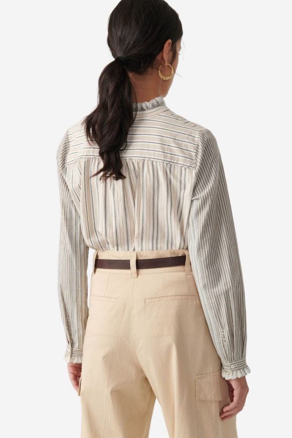 Esta camisa está confeccionada en algodón para ofrecerte total comodidad y un outfit perfecto durante todo el día. Ideal para ir al trabajo o para salir, esta camisa se convertirá rápidamente en un básico de tu armario. Mangas largas, rayas all over, canesú de los hombros realzado por chulo a rayas, esta camisa es sublime. Nos encantan los volantes en cuello, puños y botonadura que le dan volumen a la prenda.